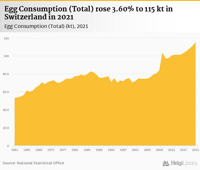 Total egg consumption rose 3.60% to 115 kt in Switzerland in 2021, according to Faostat.