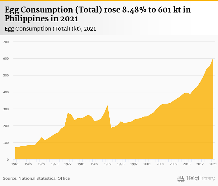 Total egg consumption rose 8.48% to 601 kt in Philippines in 2021, according to Faostat.