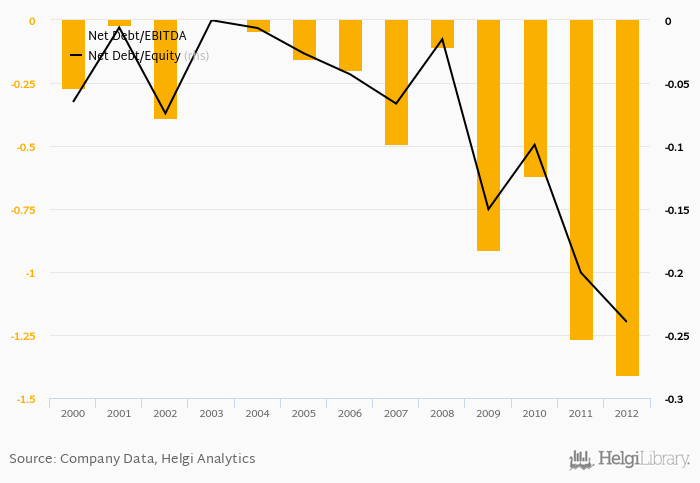 Historically, the firm’s net debt to equity reached a high of < -0.001 in 2003 and a low of -0.240 in 2012 between 2000 and 2012. The average for the last five years was -0.141%.