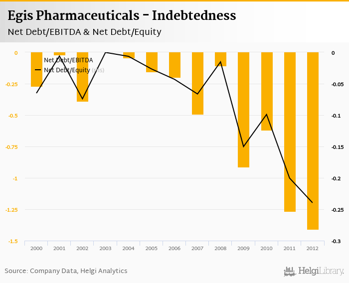 Egis Pharmaceuticals's net debt stood at HUF -43,021 mil and accounted for -0.240 of equity at the end of 2012. The ratio is down 0.039 pp compared to the previous year.