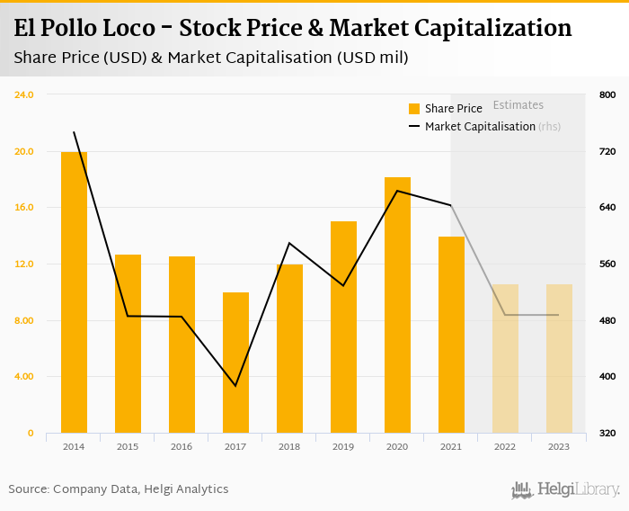 El Pollo Loco stock traded at USD 14.0 per share at the end 2021 implying a market capitalization of USD 643 mil.