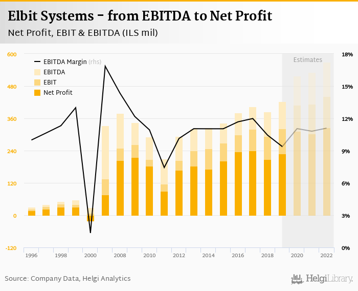 Elbit Systems made a net profit of ILS 228 mil with revenues of ILS 4,508 mil in 2019, up by 10.2% and up by 22.4%, respectively, compared to the previous year. This translates into a net margin of 5.05%.