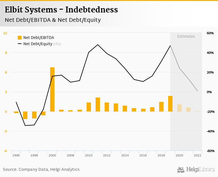 Elbit Systems's net debt stood at ILS 1,011 mil and accounted for 46.8% of equity at the end of 2019. The ratio is up 16.0 pp compared to the previous year.