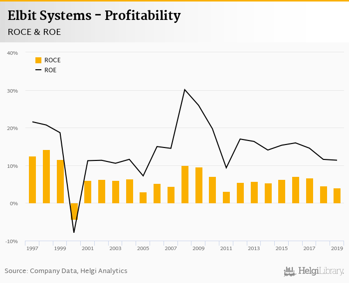 Elbit Systems made a net profit of ILS 228 mil in 2019, up 10.2% compared to the previous year. Historically, between 1996 and 2019, the company's net profit reached a high of ILS 239 mil in 2017 and a low of ILS -20.5 mil in 2000.