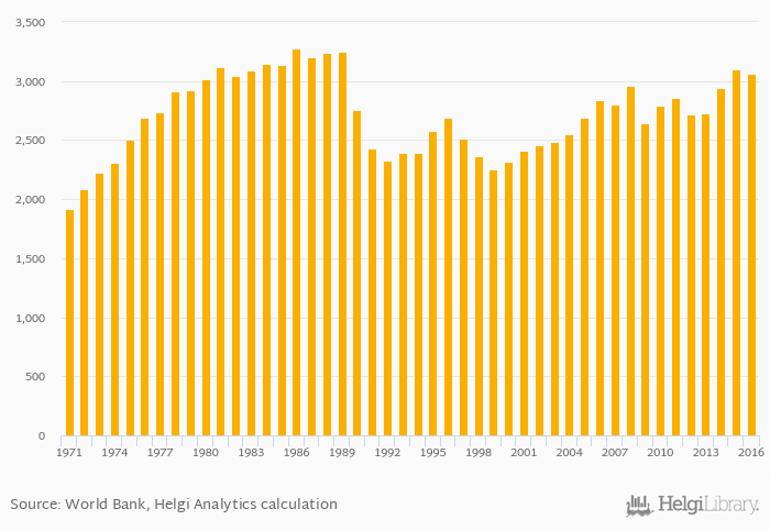 Electric power production per capita fell 1.26% to 3,061 kWh in Romania in 2016, according to World Bank / EIA.