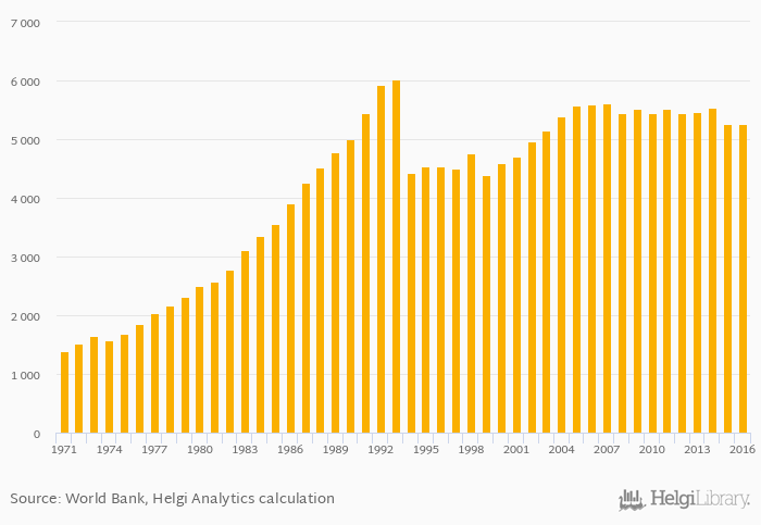 Electric power production per capita rose 0.176% to 5,262 kWh in Hong Kong in 2016, according to World Bank / EIA.