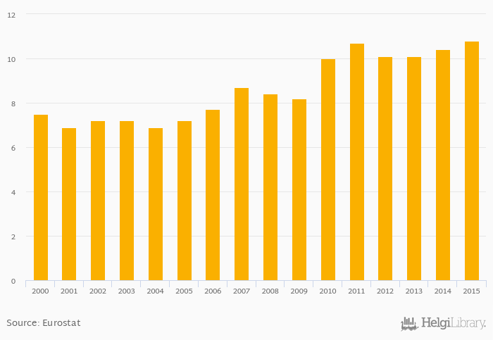 Electricity generation rose 3.85% to 10.8 in Georgia in 2015, according to Eurostat.