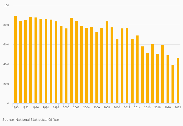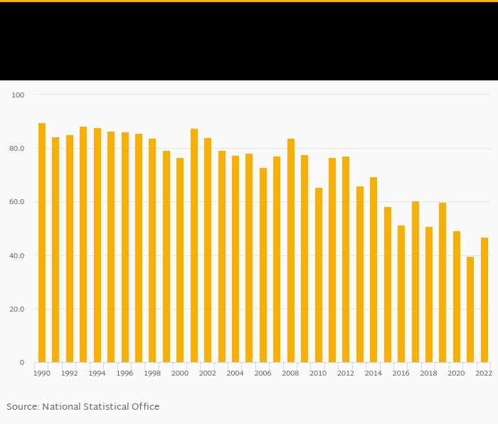 Historically, electricity production from coal sources as a percentage of total in Macedonia reached an all time high of 89.7% in 1990 and an all time low of 39.5% in 2021.