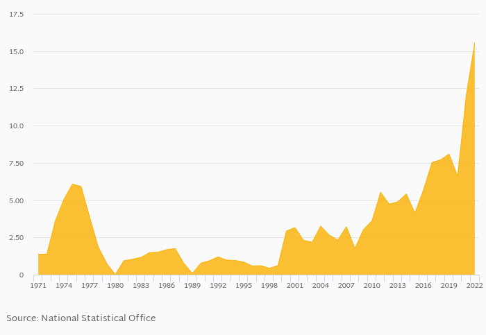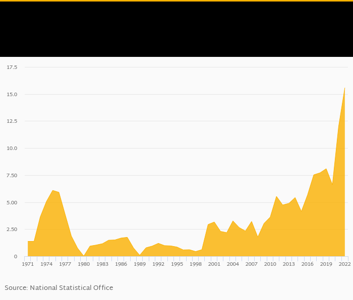 Electricity production from nuclear sources as a percentage of total rose 29.8% to 15.6% in Pakistan in 2022, according to World Bank / EIA.