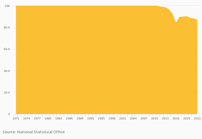 Electricity production from oil, gas & coal sources as a percentage of total fell 1.22% to 87.0% in Malta in 2022, according to World Bank / EIA.