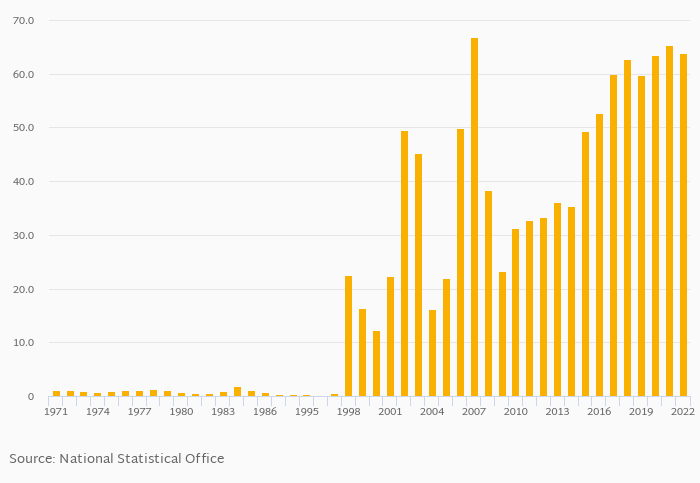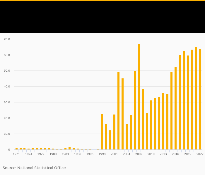 Electricity production from oil, gas & coal sources as a percentage of total fell 2.16% to 63.9% in Ghana in 2022, according to World Bank / EIA.