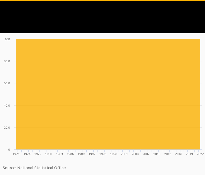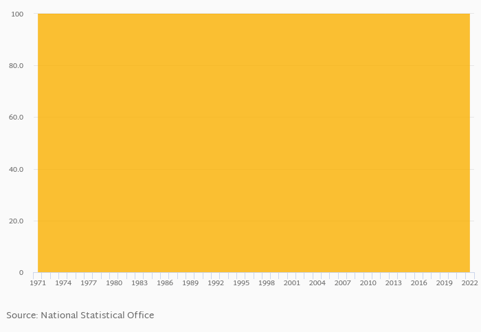 Historically, electricity production from oil, gas & coal sources as a percentage of total in Libya reached an all time high of 100% in 1997 and an all time low of 100.0% in 2020. When compared to Libya's main peers, electricity production from oil, gas & coal sources as a percentage of total in Algeria amounted to 99.3%, 98.1% in Chad, 87.9% in Egypt and 95.9% in Tunisia in 2022.