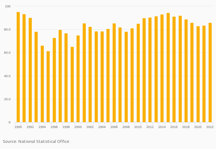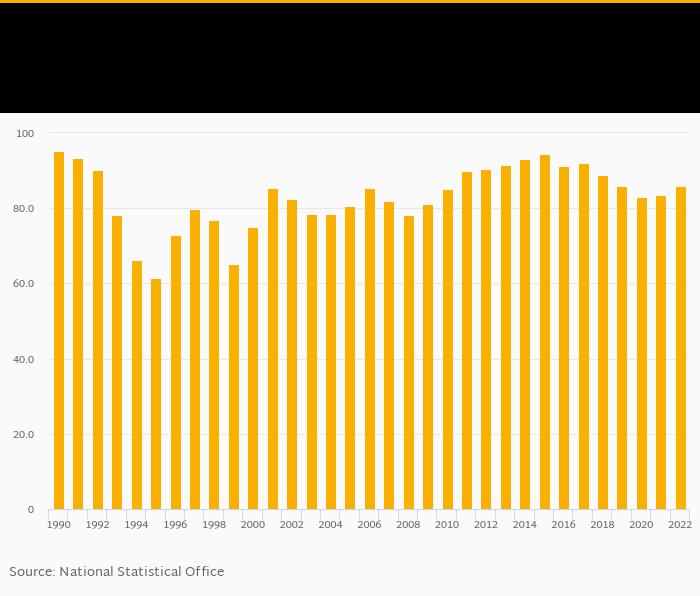 Electricity production from oil sources as a percentage of total rose 2.82% to 86.0% in Burkina Faso in 2022, according to World Bank / EIA.