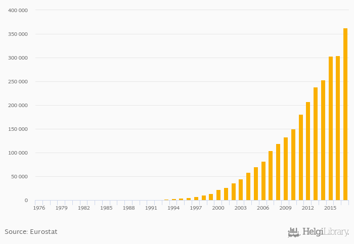 Historically, electricity production from wind power in the European Union reached an all time high of 362,267 GWh in 2017 and an all time low of 0 GWh in 1976. When compared to European Union's main peers, electricity production from wind power in China amounted to 286,081 GWh, 5,737 GWh in Japan, 139 GWh in Russia and 256,823 GWh in USA in 2017.