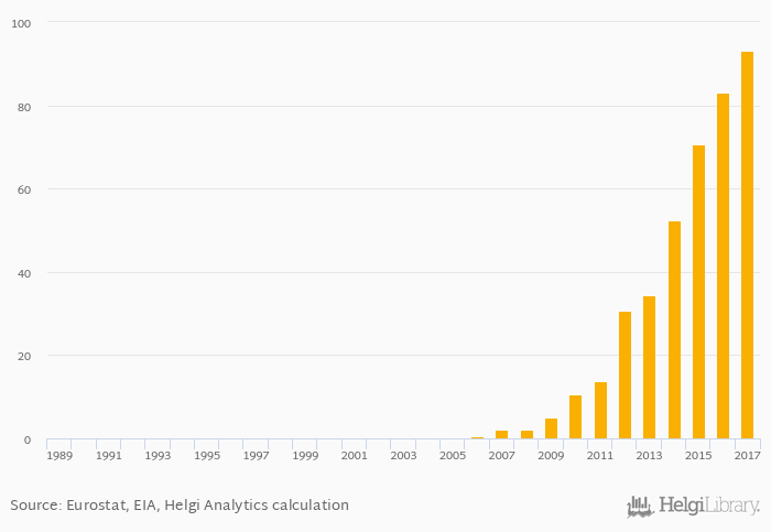 Electricity production from wind power sources per capita rose 12.3% to 93.2 kWh in Mexico in 2017, according to World Bank / EIA.