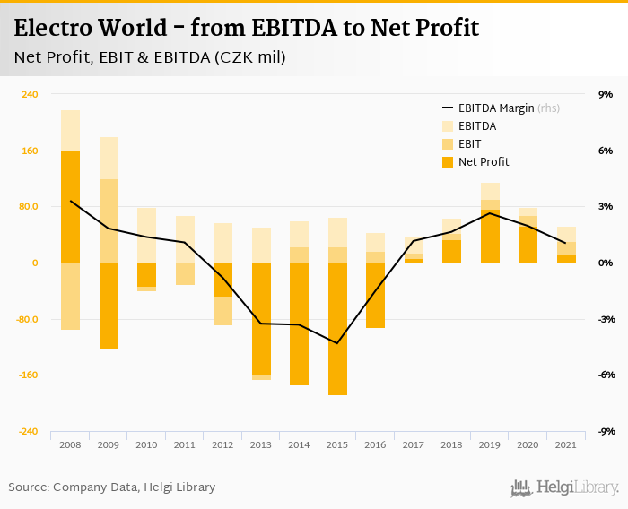 Electro World made a net profit of CZK 10.9 mil with revenues of CZK 5,089 mil in 2021, down by 79% and up by 26.7%, respectively, compared to the previous year. This translates into a net margin of 0.214%.