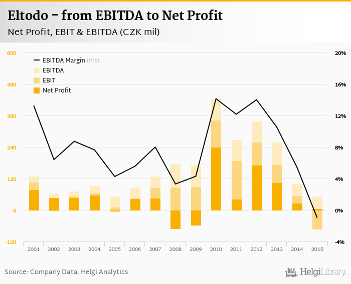 Eltodo made a net profit of CZK 6.51 mil with revenues of CZK 1,799 mil in 2015, down by 74.7% and down by 4.29%, respectively, compared to the previous year. This translates into a net margin of 0.362%.