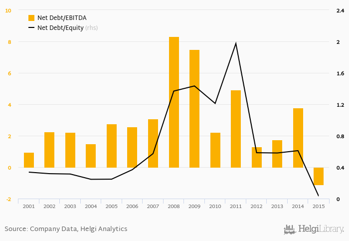 Net debt to EBITDA was calculated at -1.10x at the end of the year. That is down from 2.23x seen in 2010. The ratio reached a high of 8.31x in 2008 and a low of -1.10x in 2015.
