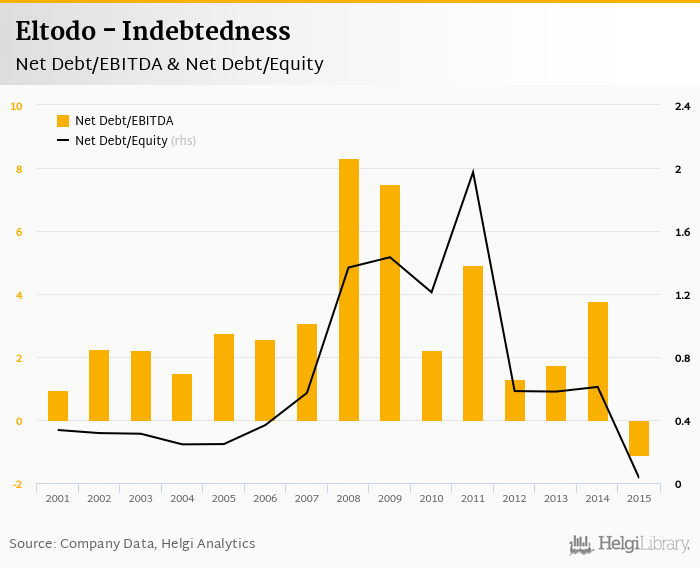 Eltodo's net debt stood at CZK 20.4 mil and accounted for 0.031 of equity at the end of 2015. The ratio is down 0.579 pp compared to the previous year.