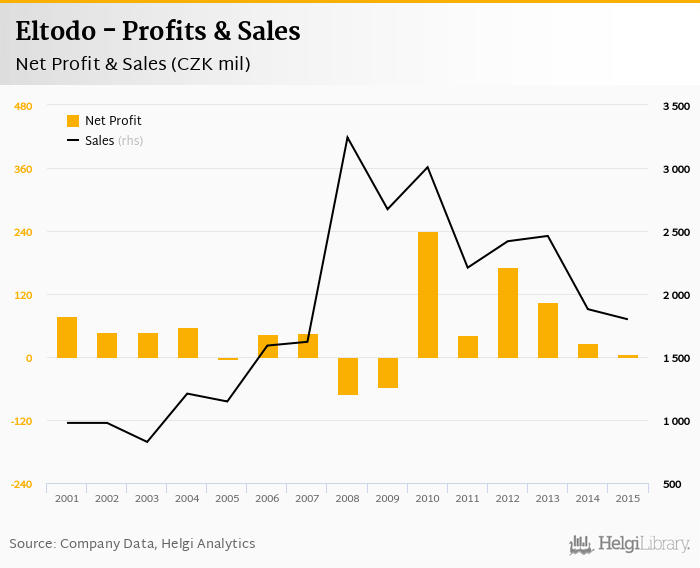 Eltodo made a net profit of CZK 6.51 mil in 2015, down 74.7% compared to the previous year. Total sales reached CZK 1,799 mil, which is down 4.29% when compared to the previous year.