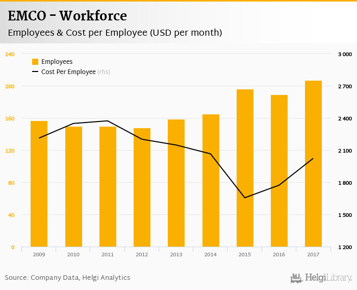 EMCO employed 207 employees in 2017, up 9.52% compared to the previous year. Historically, between 2009 and 2017, the firm's workforce hit a high of 207 employees in 2017 and a low of 148 employees in 2012.