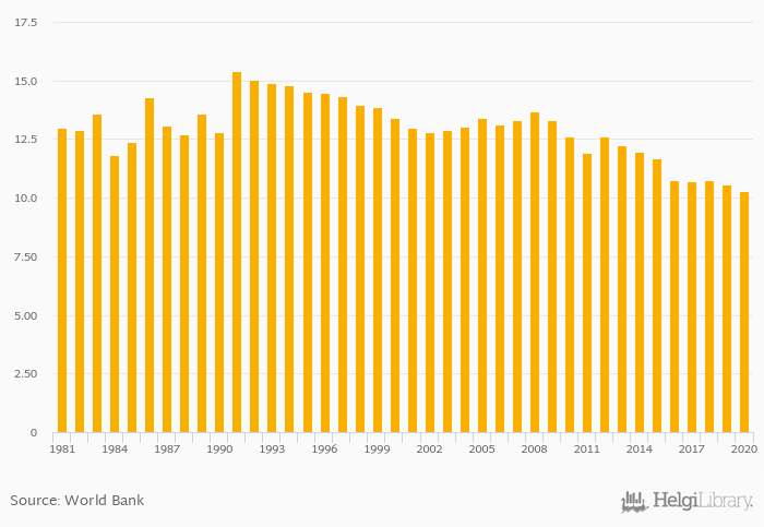 | Trinidad and Tobago | % | 12.5% | 12.4% | 12.2% | 12.7% | 13.0% | ||||||||||||||||