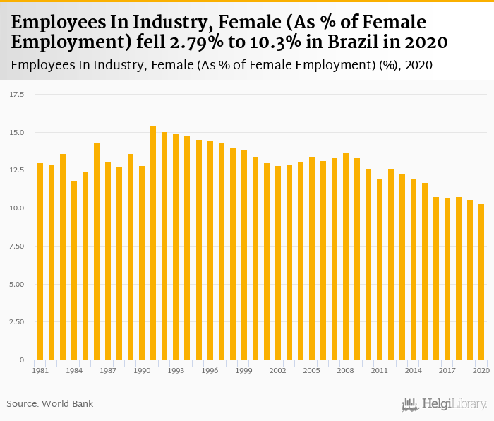 Employees In Industry, Female (As % of Female Employment) fell 2.79% to 10.3% in Brazil in 2020, according to World Bank.