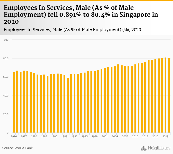 Employees In Services, Male (As % of Male Employment) fell 0.891% to 80.4% in Singapore in 2020