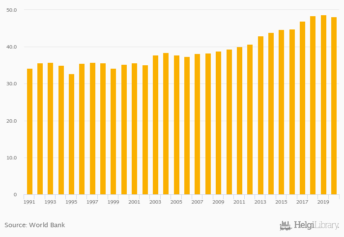 Historically, Employees In Services, Male (As % of Male Employment) in Kyrgyzstan reached an all time high of 48.7% in 2019 and an all time low of 32.7% in 1995. When compared to Kyrgyzstan's main peers, Employees In Services, Male (As % of Male Employment) in China amounted to 42.6%, 54.2% in Kazakhstan, 43.9% in Tajikistan and 38.5% in Uzbekistan in 2020.