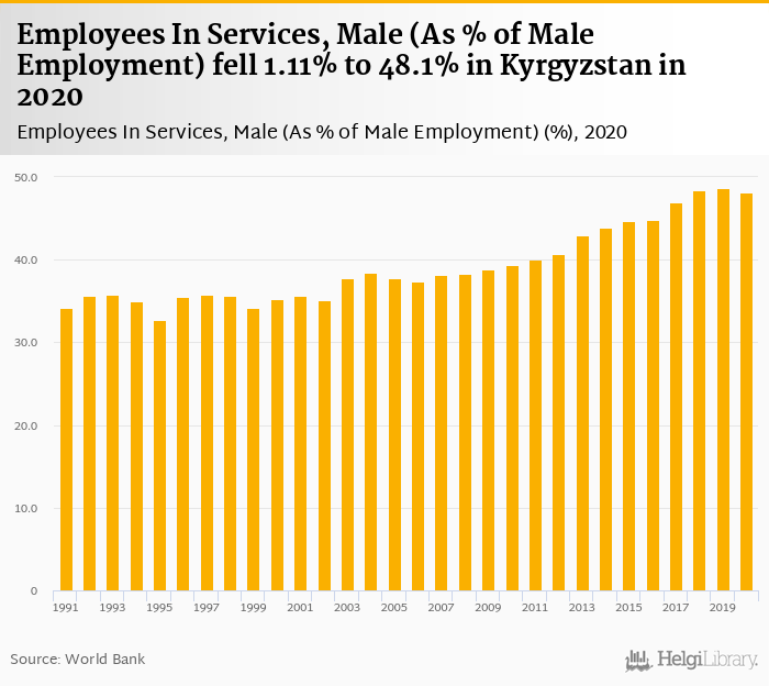 Employees In Services, Male (As % of Male Employment) fell 1.11% to 48.1% in Kyrgyzstan in 2020, according to World Bank.