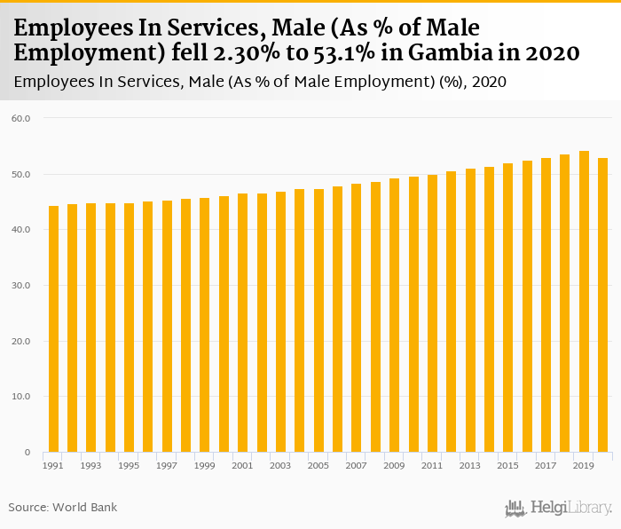 Employees In Services, Male (As % of Male Employment) fell 2.30% to 53.1% in Gambia in 2020, according to World Bank.