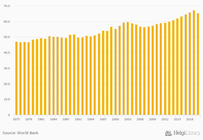 Historically, Employees In Services, Male (As % of Male Employment) in Venezuela reached an all time high of 67.2% in 2019 and an all time low of 46.6% in 1976. When compared to Venezuela's main peers, Employees In Services, Male (As % of Male Employment) in Brazil amounted to 60.7%, 53.4% in Colombia, 46.4% in Guyana and 58.7% in Trinidad and Tobago in 2020.