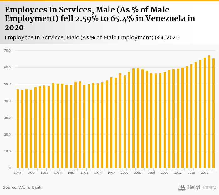 Employees In Services, Male (As % of Male Employment) fell 2.59% to 65.4% in Venezuela in 2020, according to World Bank.