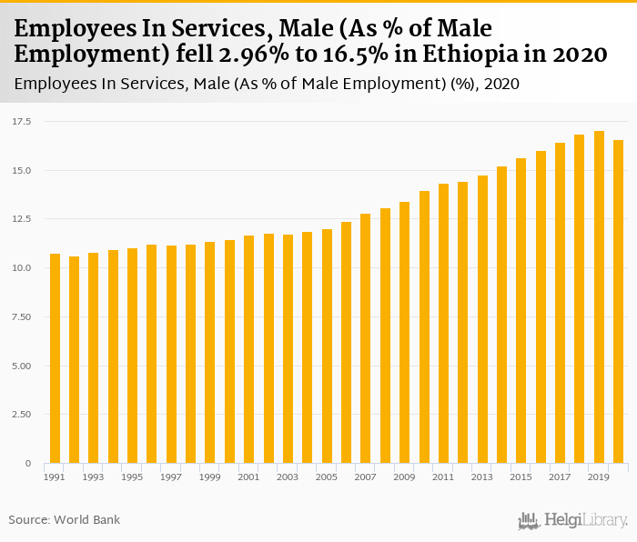 Employees In Services, Male (As % of Male Employment) fell 2.96% to 16.5% in Ethiopia in 2020, according to World Bank.
