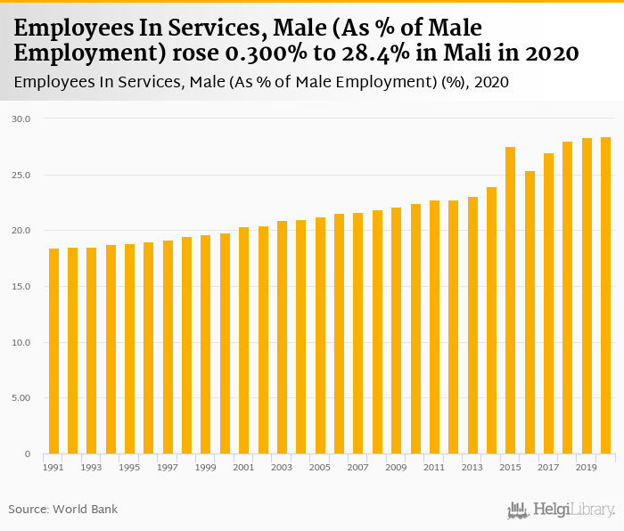 Employees In Services, Male (As % of Male Employment) rose 0.300% to 28.4% in Mali in 2020, according to World Bank.