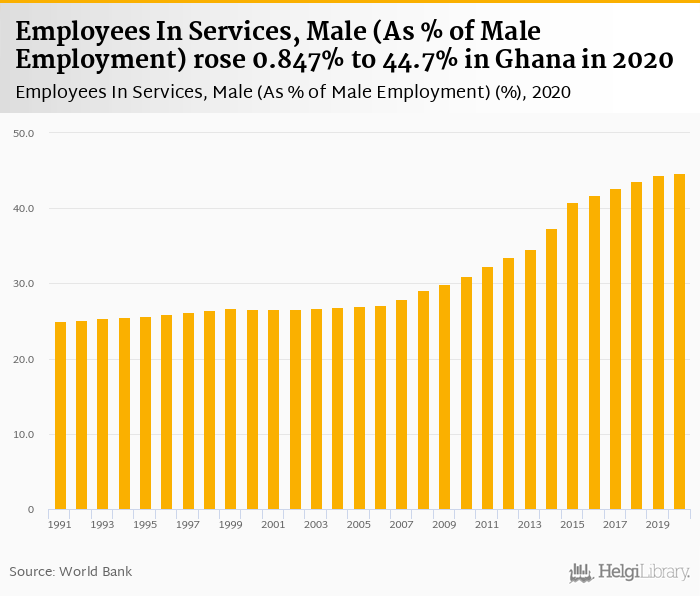 Employees In Services, Male (As % of Male Employment) rose 0.847% to 44.7% in Ghana in 2020, according to World Bank.