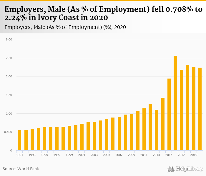 Employers, Male (As % of Employment) fell 0.708% to 2.24% in Ivory Coast in 2020, according to World Bank.