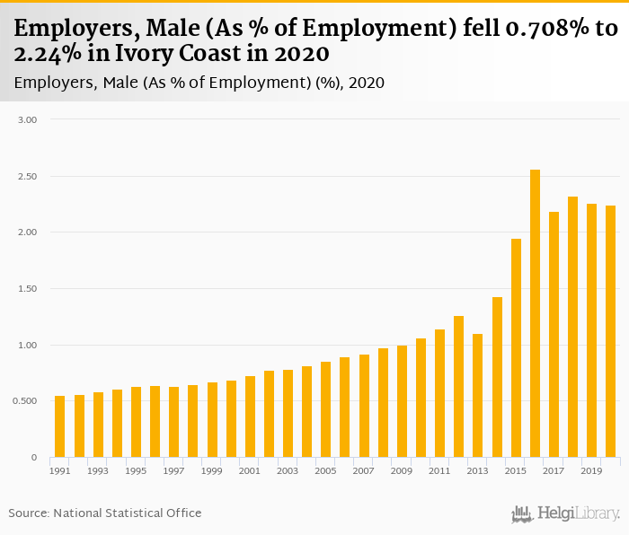 Employers, Male (As % of Employment) fell 0.708% to 2.24% in Ivory Coast in 2020, according to .