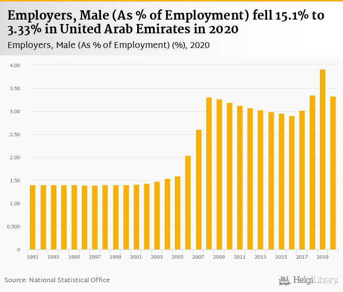 Employers, Male (As % of Employment) fell 15.1% to 3.33% in United Arab Emirates in 2020, according to .