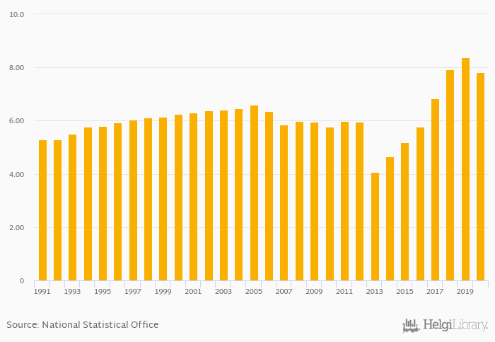 Employers, Male (As % of Employment) fell 6.82% to 7.82% in Namibia in 2020, according to .