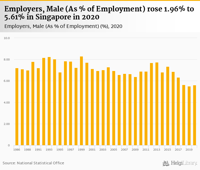 Employers, Male (As % of Employment) rose 1.96% to 5.61% in Singapore in 2020, according to .