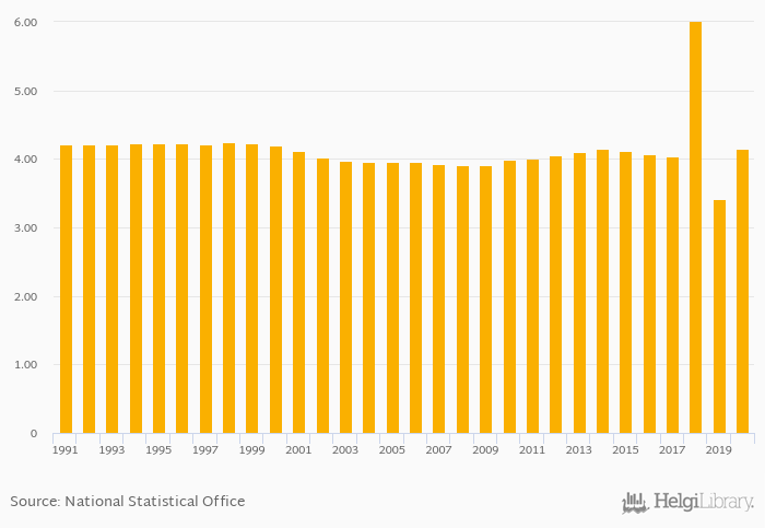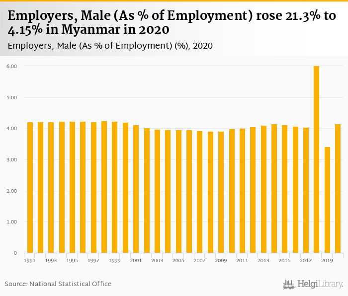 Employers, Male (As % of Employment) rose 21.3% to 4.15% in Myanmar in 2020, according to .