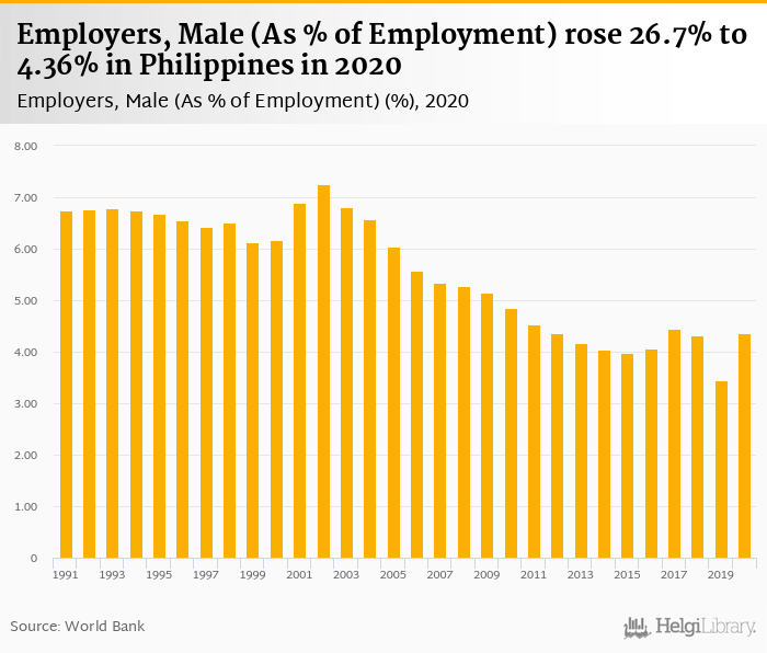 Employers, Male (As % of Employment) rose 26.7% to 4.36% in Philippines in 2020, according to World Bank.