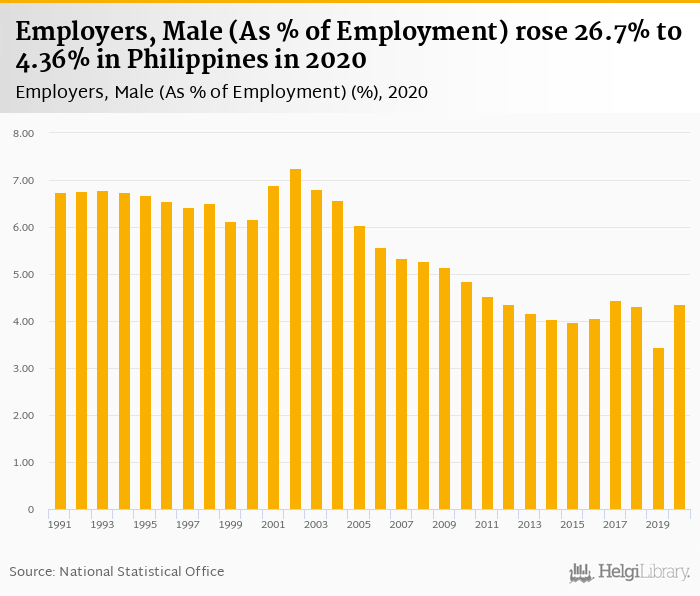 Employers, Male (As % of Employment) rose 26.7% to 4.36% in Philippines in 2020, according to .