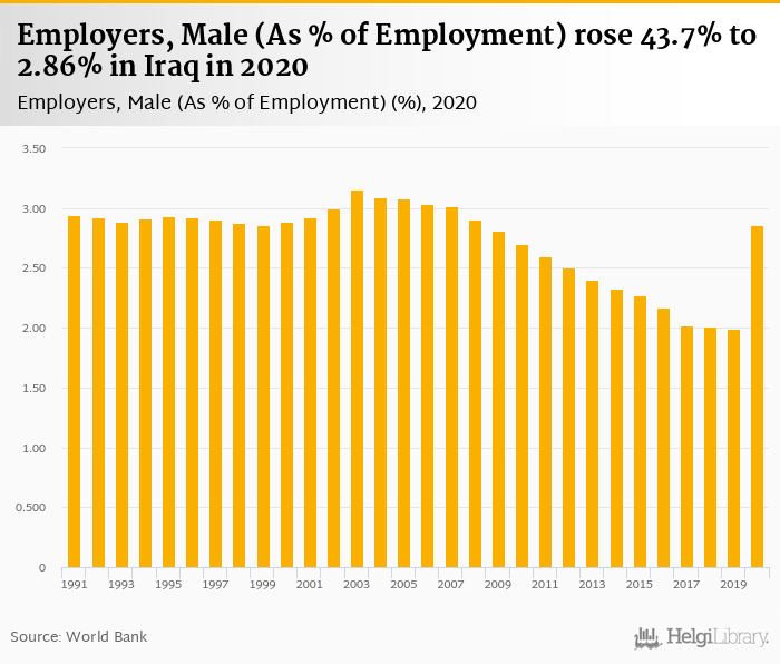 Employers, Male (As % of Employment) rose 43.7% to 2.86% in Iraq in 2020, according to World Bank.