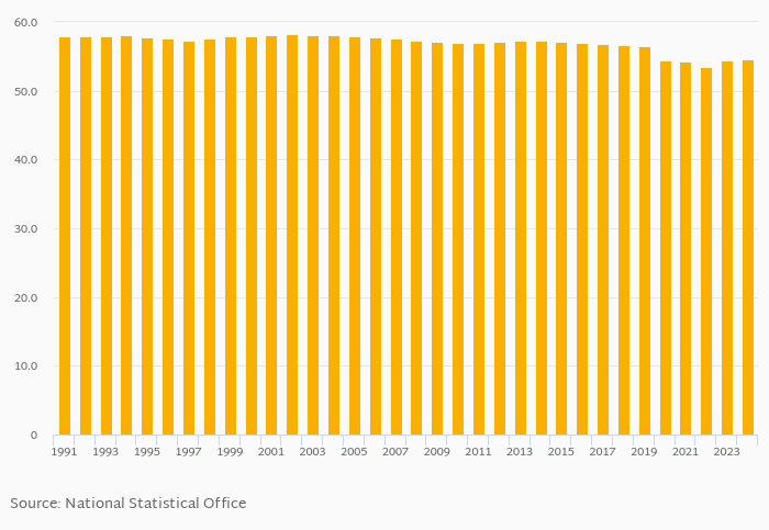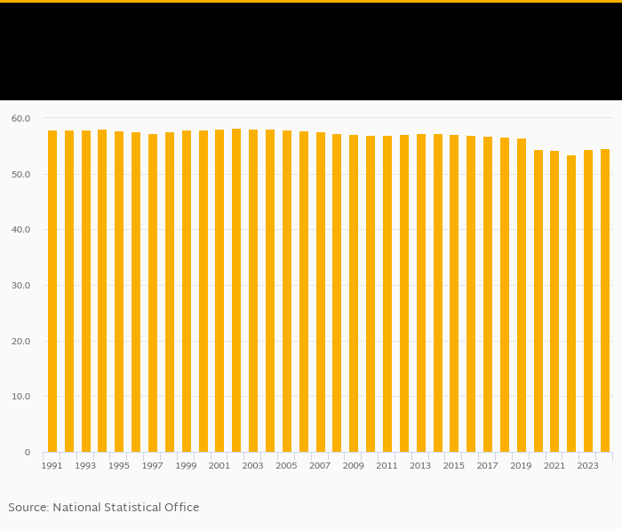 | Zimbabwe | % | 56.7% | 56.5% | 54.5% | 54.2% | 53.5% |