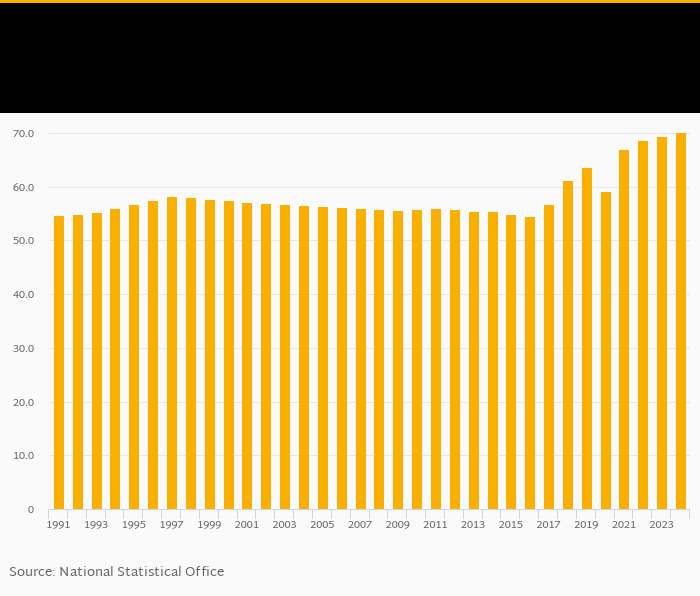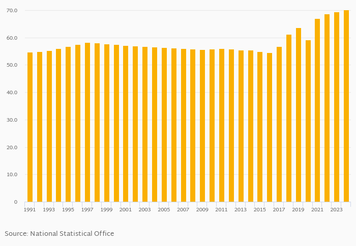 Employment to Population Ratio (15+ Years Old, Female) rose 0.677% to 69.9% in Bolivia in 2024, according to .