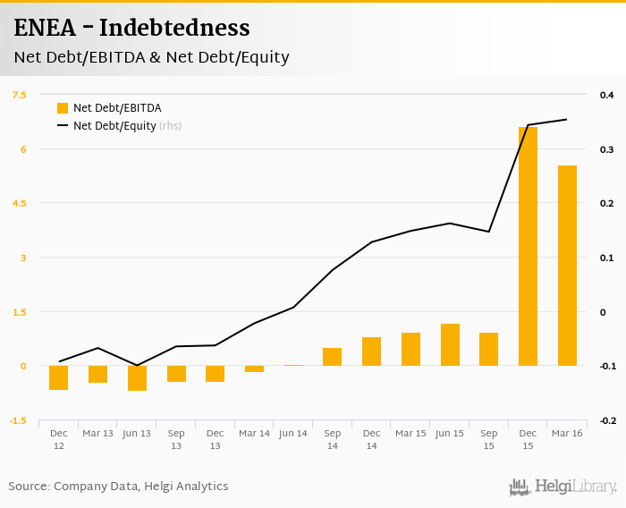 ENEA's net debt stood at PLN 4,374 mil and accounted for 0.353 of equity at the end of 1Q2016. The ratio is up 0.206 pp compared to the previous year.