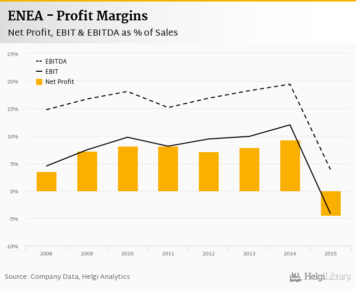 ENEA made a net profit of PLN -435 mil with revenues of PLN 9,848 mil in 2015, down by 148% and down by 0.071%, respectively, compared to the previous year.