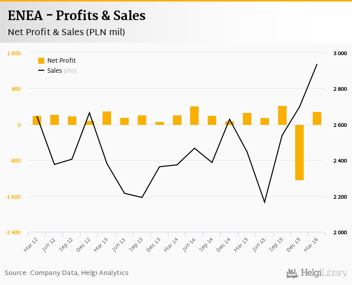 ENEA made a net profit of PLN 290 mil in 1Q2016, up 9.45% compared to the previous year. Total sales reached PLN 2,937 mil, which is up 20% when compared to the previous year.